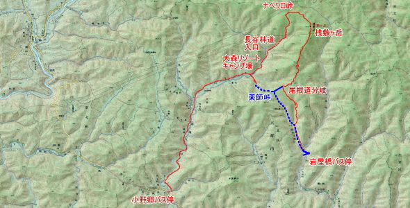 ナベクロ峠→長谷林道入口→大森リゾートキャンプ場(ルート変更)→小野郷バス停