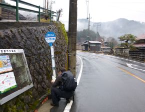 ●山頂での缶ビールの乾杯を控え下山に備えたが、長谷の沢伝いのルートは山の地図では点線で記されていることから、やはりかなりの悪路でコースタイムは50分のところを1時間以上要してしまう羽目となる。これが誤算となり、帰りのバスの出発時間の14時30分に岩屋橋バス停に戻ることができず、急遽、国道162号の周山街道を運行するJRバスに乗車するため、小野郷バス停まで約1時間以上舗装道の車道を雨が降りしきる中歩き続けることとなった。このバスの出発時間は事前に一切リサーチはしていなかったが、結果的にバス停での待ち時間は1時間程で事なきを得る。ここで山頂でお預けの缶ビールの乾杯でバスを待つこととなる。