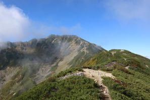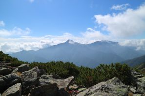 ●この日も山頂では辺りの山々はガスがかかった状況であったことから、山頂の南東側に日本百名山最高峰の富士山やその次の北岳などの山頂を眺めることはできなかったが、道中に前日に登頂を果たした甲斐駒ヶ岳、また、彼方にある北アルプスの槍ヶ岳並びに穂高連峰を眺めることができたので、内容的には問題はなかったと感じているところである。