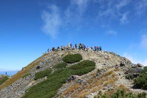 ●今回の山行き遠征の最終日は、前日と同様に長野と山梨の県境にある日本百名山の仙丈ヶ岳の山頂を目指すこととなる。前日の甲斐駒ケ岳の登頂では、コースタイムから大きく後れを取り、メンバー皆疲労が蓄積したコンディションであったが、当初の予定より早く出発できたことと天気もまずまずだったことや足慣らしができたこともあって、下山のバスの発車時間に遅れることもなく無事にこなすこととなる。
