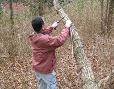 いつもの山行きメンバーも集合し近くの里山へ向かう。2年振りとあって進入路は山草に覆われていたので、早速草刈り機にて刈り取る。後日、原木に菌糸を入れ運搬するのに車が必要であるからだ。当方も最初に刈り取り作業を行ったが、慣れていないせいか直ぐに手がしびれ出す。小休止の後に他のメンバーに変わって貰った。山では平行してクヌギの木を伐採するが、こちらは、チェーンソーを新調したせいかスムーズに作業が進められた。木は出来れば太い方が良いのだが、後の運搬のことを考え程々の木5本を伐採する。本来ならここで本日の作業は終了なのだが、思いの外伐採が早く終わったので引き続き伐採したクヌギの木を90cm程度に切る作業を行うこととなった。