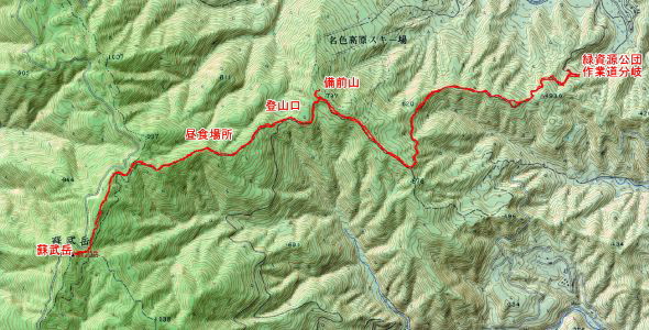 緑資源公団作業道分岐→備前山(797m)(休憩)→登山口→蘇武岳(1,074m)(休憩)→