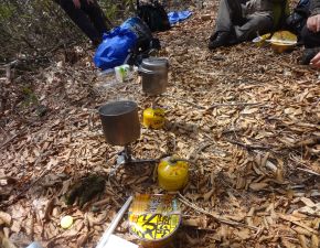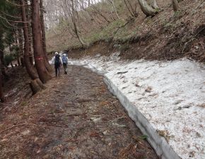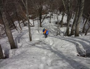 ●山頂からは、残雪の中で踏み跡を確認しながらいつも以上に慎重に道を下り、途中で昼食を経てながら何とか下山も無事に終える。下山後は、神鍋温泉美肌の湯「ゆとろぎ」にて入浴を済まし、その後は夕食等の食材の調達を経て、宿泊地の「湯の原温泉オートキャンプ場」へと戻る。