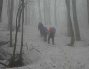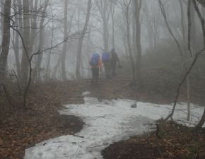 ●登山口からは本格的な登山道となり、また、出発時の好天からは想定外のガスが漂い出し、さらに残雪などで無事に山頂までたどり着けるのかと不安が募ったが、何とかコースタイムより約15分遅れで何とか登頂を果たす。なお、山頂では遠くの眺望は望めず、さらに風が強く前日と同様に寒かったので、足早にここを後にする。