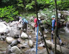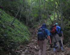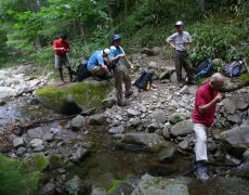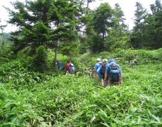 ●夏季研修協議会の2日目は、群馬・栃木県境の皇海山を目指すこととなった。宿泊地の「星の降る森」オートキャンプ場を後にし、国道120号等を経て沼田市利根町追貝方面へと向かい栗原川林道に入る。
