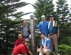●メンバー全員山頂へ到着後記念撮影を行うが、ここも樹林に覆われ期待していた周辺の山々の眺望をほとんど観ることもできず、登頂して30分程で下山をすることとなる。