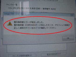 ●ボードを装着しまたそれぞれのインストールも終え、いよいよテレビ視聴に向け初期設定に取りかかる。ところが、著作権エラーが発生、「著作権保護(COPP/HDCP)に対応したモニタ、グラフィック環境が正しく接続されているかどうか確認してください」が表示され初期設定ができない状態となる。