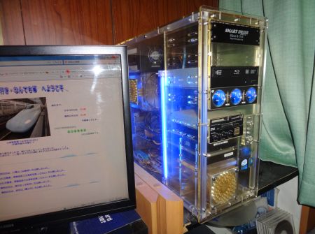 ●この「TowarPC2011」は、正面はレッドの大型LEDファンと側面はブルーのネオン管、ケース内部はCPUファンが同じくブルーのLEDで照らされ、前のアクリルケースPCと同様派手な外観となっている。なお、ケースには大型ファンが複数装着され熱対策も万全であるようだ?。