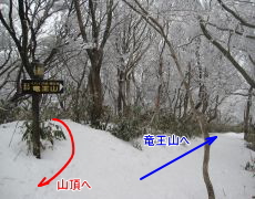 ●この山の登山コースは、表参道・北参道・水無山北尾根・竜王山経由の4ルートがあるが、今回は「表参道」コースにて山頂へと向かう。このコースは全般的に植林帯の中でのジグザグな道が主だったが、小屋や案内看板が多く設置され、整備の行き届いた登山コースであった。なお、心配?された積雪には二合目を過ぎた辺りから見受けられ、オークションで落札したアイゼンをここで装着し今回の一つ目の目的を達成する。