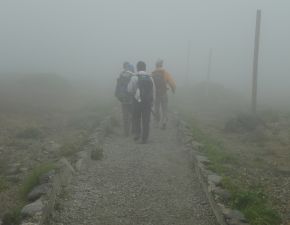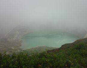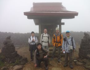 ●このコースは駐車場と山頂の標高差が約100mで、コースタイムも片道約45分程度であることから、連日の山行きで身体の疲労が溜まっていた中でも容易に山頂に到着することができた。しかしながら、山頂でも濃いガスが漂い辺りの眺望を楽しむことができなかったので、記念撮影を行ったのみでここを後にする。駐車場に戻る直前の馬の背辺りで、ガスが少し晴れ御釜がうっすらと眺めることができたことがせめてもの救いだったようだ。