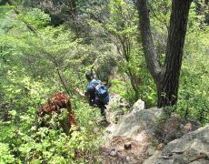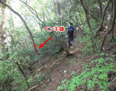 ●やや見切り発車的ではあったが、展望台から瑞宝寺谷西尾根方面へと向かう。登り始めは急登でまた微かな踏み跡?だけが頼りだったが、やがて尾根らしき場所に到着してからはペンキ跡があり、道幅は狭いが道の状態は安定してきたのでそのまま先へと進む。尾根のピークあたりで小休止を取り、携帯したGPSで六甲最高峰方面へ向かっていることを確認しながら、東六甲縦走路分岐の車道に何とか到着する。
